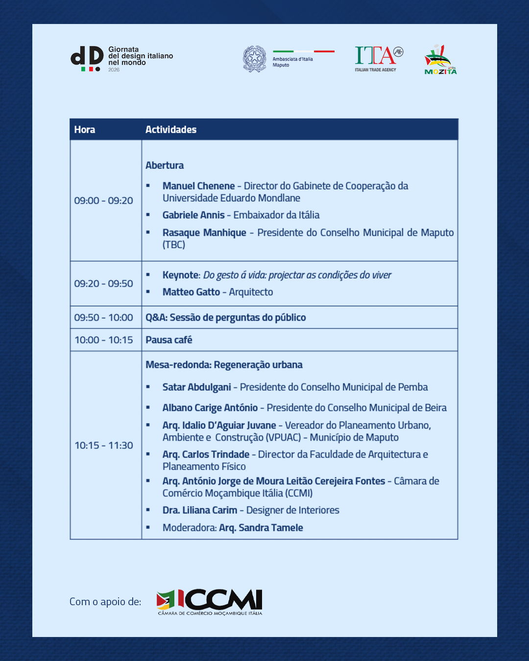 Seguiu-se uma mesa-redonda dedicada à regeneração urbana, com a participação do Presidente do Conselho Municipal de Pemba, Satar Abdulgani, do Presidente do Conselho Municipal da Beira, Albano Carige António, do Vereador do Planeamento Urbano, Ambiente e Construção do Município de Maputo, Idalio D’Aguiar Juvane, do representante da Câmara de Comércio Moçambique-Itália, António Jorge de Moura Leitão Cerejeira Fontes, e da designer Liliana Carim. O debate, moderado pela arquiteta Sandra Tamele, destacou o papel estratégico do design nos processos de desenvolvimento urbano sustentável.