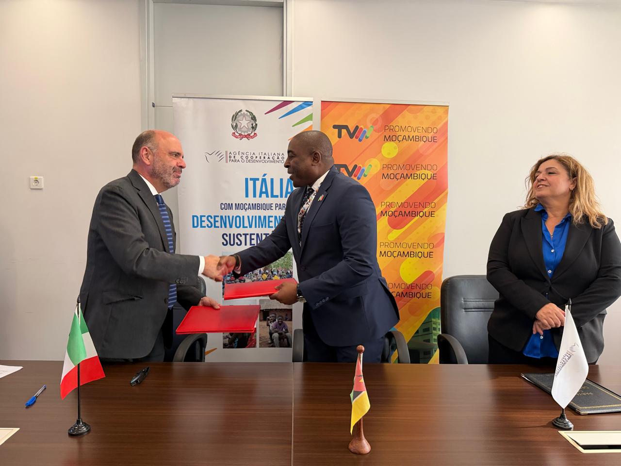 The signing ceremony was attended by Ambassador Gabriele Annis, the Chairman of the Board of Directors of TVM, Victor Nhatitima, and the Acting Director of the AICS Office in Maputo, Maria Cristina Pescante.